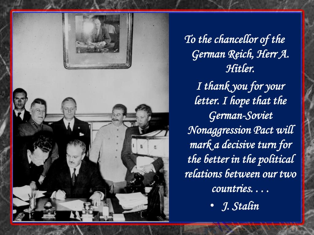 To the chancellor of the German Reich, Herr A. Hitler. I thank you for your letter. I hope that the German-Soviet Nonaggression Pact will mark a decisive turn for the better in the political relations between our two countries. . . . • J. Stalin