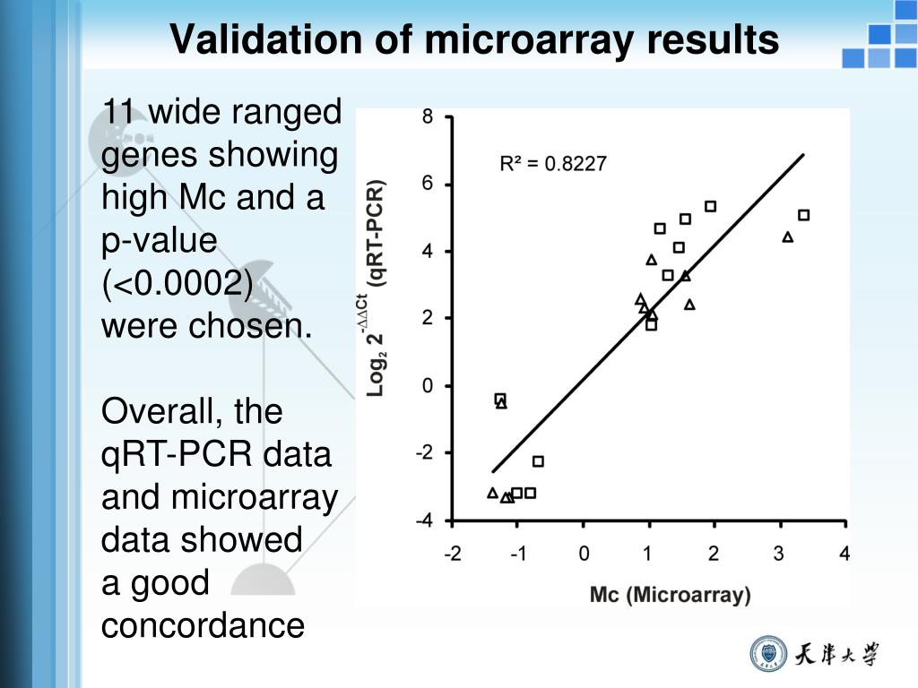 Validation of microarray results 11 wide ranged genes showing high Mc and a p-value (<0.0002) were chosen. Overall, the qRT-PCR data and microarray data showed a good concordance