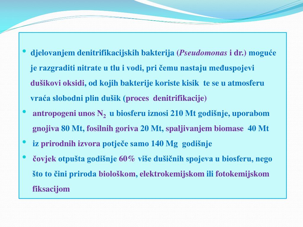djelovanjem denitrifikacijskih bakterija (Pseudomonas i dr.) moguće • je razgraditi nitrate u tlu i vodi, pri čemu nastaju međuspojevi • dušikovi oksidi,od kojih bakterije koriste kisik te se u atmosferu • vraća slobodni plin dušik (proces denitrifikacije) • antropogeni unos N2u biosferu iznosi 210 Mtgodišnje, uporabom • gnojiva 80 Mt, fosilnihgoriva20 Mt, spaljivanjembiomase 40 Mt • iz prirodnihizvora potječe samo 140 Mg godišnje • čovjek otpušta godišnje 60% više dušičnih spojeva u biosferu, nego • što to čini priroda biološkom, elektrokemijskom ili fotokemijskom • fiksacijom