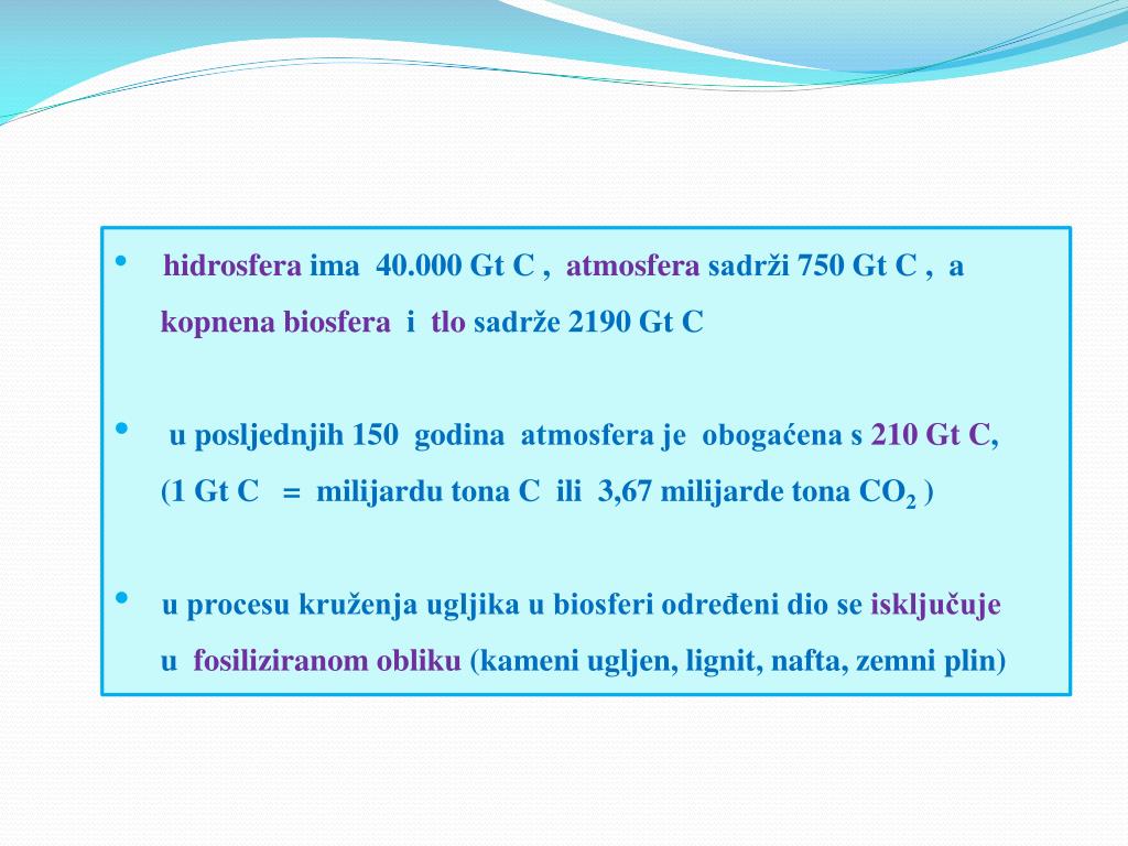 hidrosferaima40.000 GtC, atmosfera sadrži 750 GtC , a • kopnena biosferaitlosadrže 2190 GtC • u posljednjih 150 godina atmosfera je obogaćena s210 GtC, • (1 GtC =milijardutona C ili3,67 milijardetona CO2) • u procesu kruženja ugljika u biosferi određeni dio se isključuje • u fosiliziranom obliku (kameni ugljen, lignit, nafta, zemni plin)