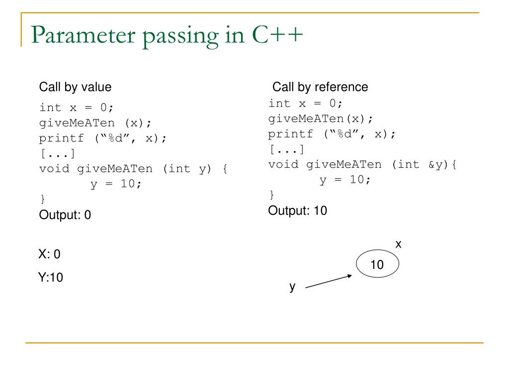 Programming overview Part II. 10. Parameter passing in C++. Call by value. Call by reference. int x = 0; giveMeATen(x); printf (“%d”, x); [...] void giveMeATen (int &y){ y = 10; } Output: 10. int x = 0; giveMeATen (x); printf (“%d”, x); [...] void giveMeATen (int y) {