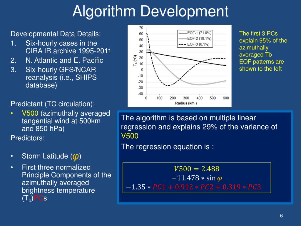 Algorithm Development The first 3 PCs explain 95% of the azimuthally averaged Tb EOF patterns are shown to the left The algorithm is based on multiple linear regression and explains 29% of the variance of V500 The regression equation is : Developmental Data Details: • Six-hourly cases in the CIRA IR archive 1995-2011 • N. Atlantic and E. Pacific • Six-hourly GFS/NCAR reanalysis (i.e., SHIPS database) Predictant (TC circulation): • V500 (azimuthally averaged tangential wind at 500km and 850 hPa) Predictors: • Storm Latitude (ᵩ) • First three normalized Principle Components of the azimuthally averaged brightness temperature (Tb)PCs