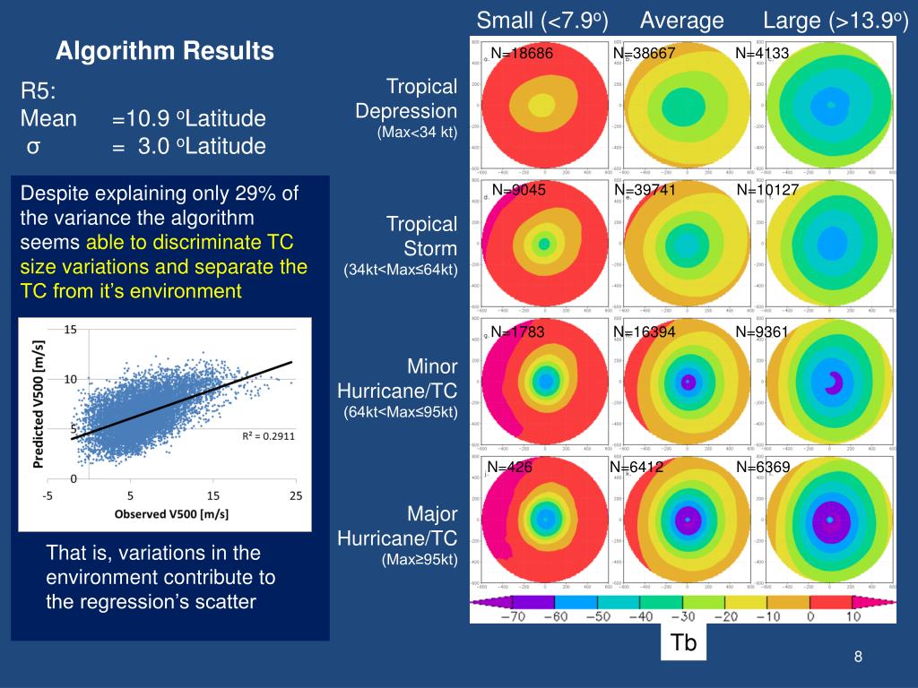 Small (<7.9o) Average Large (>13.9o) Algorithm Results N=18686 N=38667 N=4133 Tropical Depression (Max<34 kt) • R5: • Mean =10.9 oLatitude • σ = 3.0 oLatitude Despite explaining only 29% of the variance the algorithm seems able to discriminate TC size variations and separate the TC from it’s environment N=9045 N=39741 N=10127 Tropical Storm (34kt<Max≤64kt) N=1783 N=16394 N=9361 Minor Hurricane/TC (64kt<Max≤95kt) N=426 N=6412 N=6369 Major Hurricane/TC (Max≥95kt) That is, variations in the environment contribute to the regression’s scatter Tb