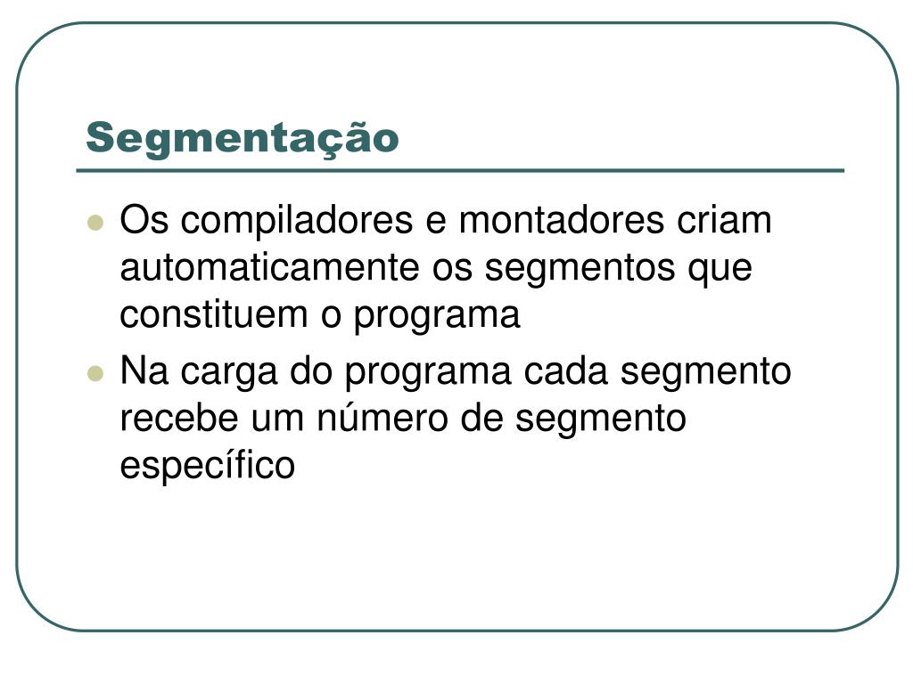 Segmentação • Os compiladores e montadores criam automaticamente os segmentos que constituem o programa • Na carga do programa cada segmento recebe um número de segmento específico