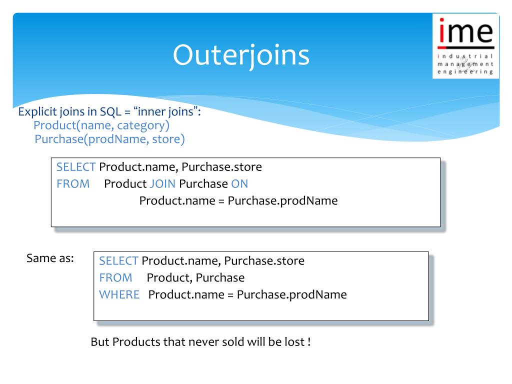 Outerjoins Explicit joins in SQL = “inner joins”: Product(name, category) Purchase(prodName, store) SELECT Product.name, Purchase.store FROM Product JOIN Purchase ON Product.name = Purchase.prodName Same as: SELECT Product.name, Purchase.store FROM Product, Purchase WHERE Product.name = Purchase.prodName But Products that never sold will be lost !