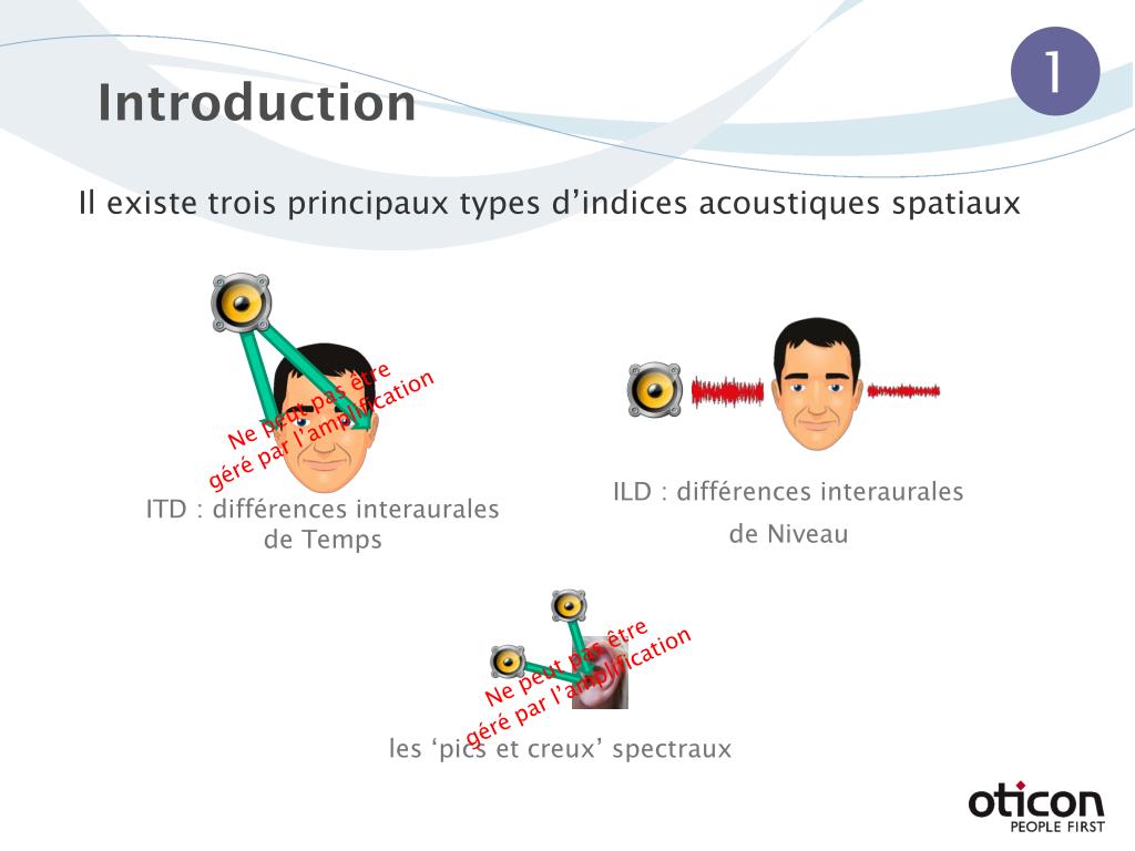 1 Introduction • Il existe trois principaux types d’indices acoustiques spatiaux Ne peut pas être géré par l’amplification • ILD : différences interaurales • de Niveau • ITD : différences interaurales de Temps Ne peut pas être géré par l’amplification • les ‘pics et creux’ spectraux