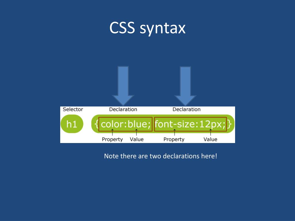 Where does CSS go in a web page? • External style sheet <head> <link rel="stylesheet" type="text/css" href="mystyle.css" /></head> • Internal style sheet <head> <style type="text/css">hr{color:sienna;} p {margin-left:20px;} </style></head> • Inline styles <p style="color:sienna;margin-left:20px">This is a paragraph.</p>