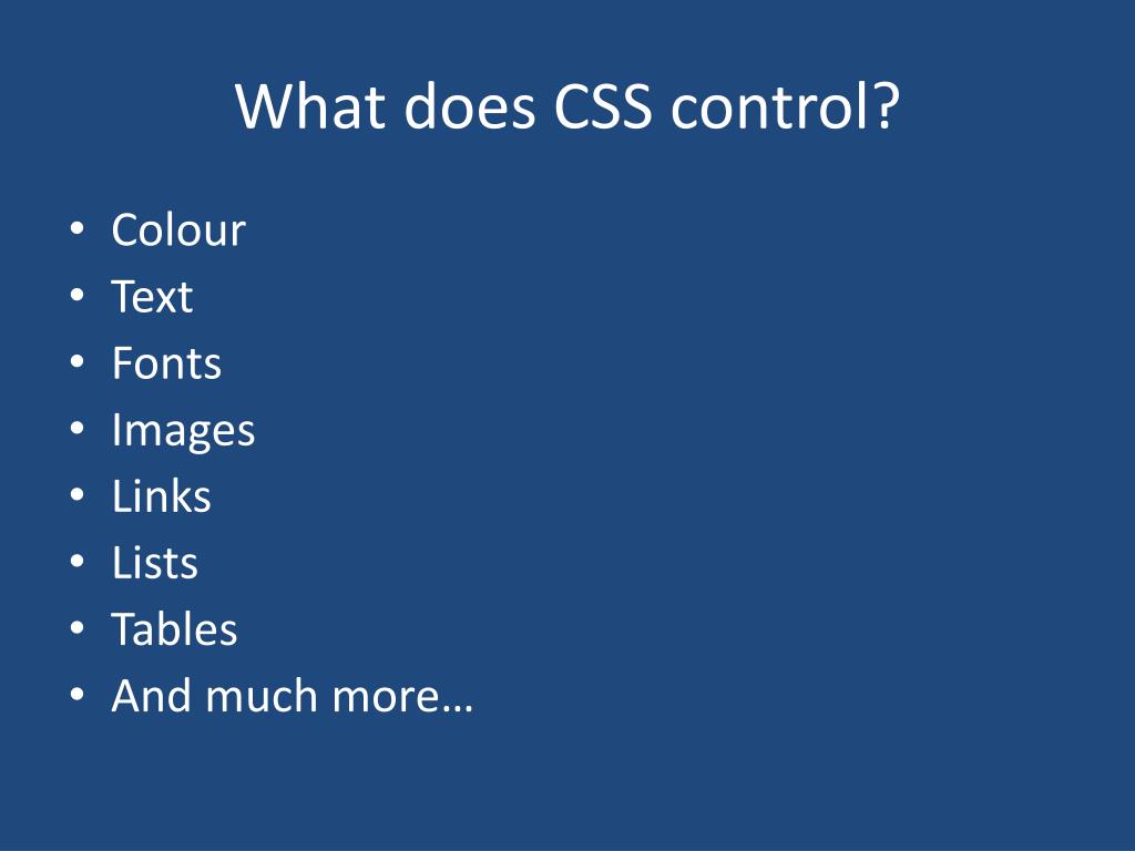 What does CSS control? • Colour • Text • Fonts • Images • Links • Lists • Tables • And much more…
