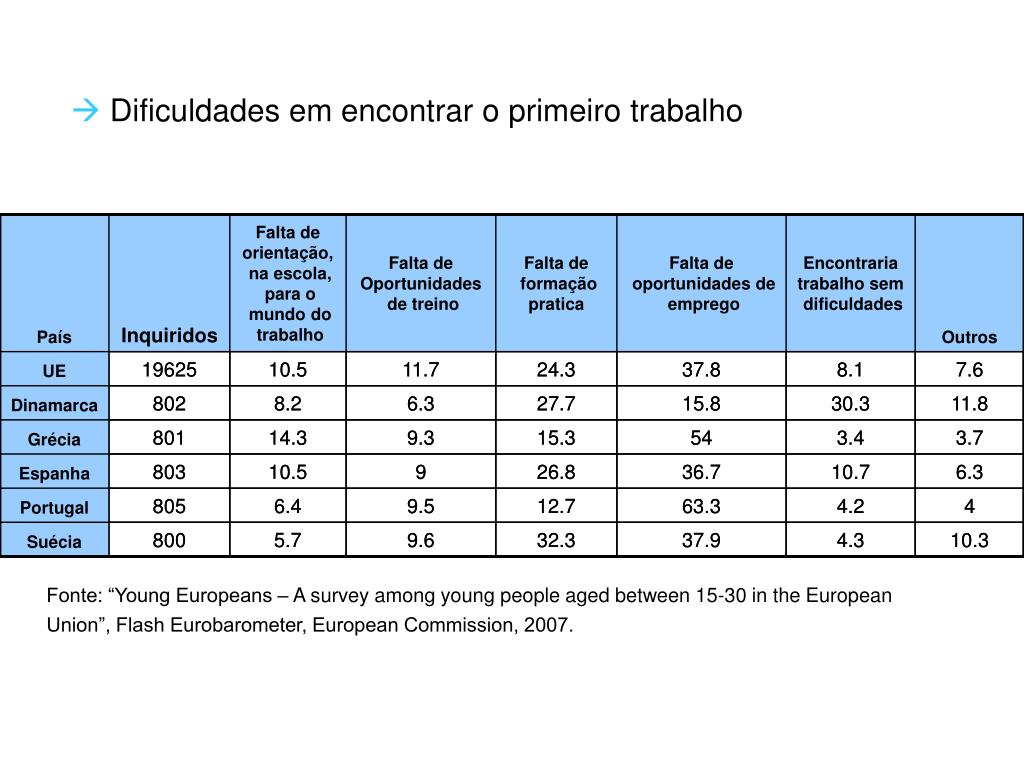 Dificuldades em encontrar o primeiro trabalho Fonte: “Young Europeans – A survey among young people aged between 15-30 in the European Union”, Flash Eurobarometer, European Commission, 2007.