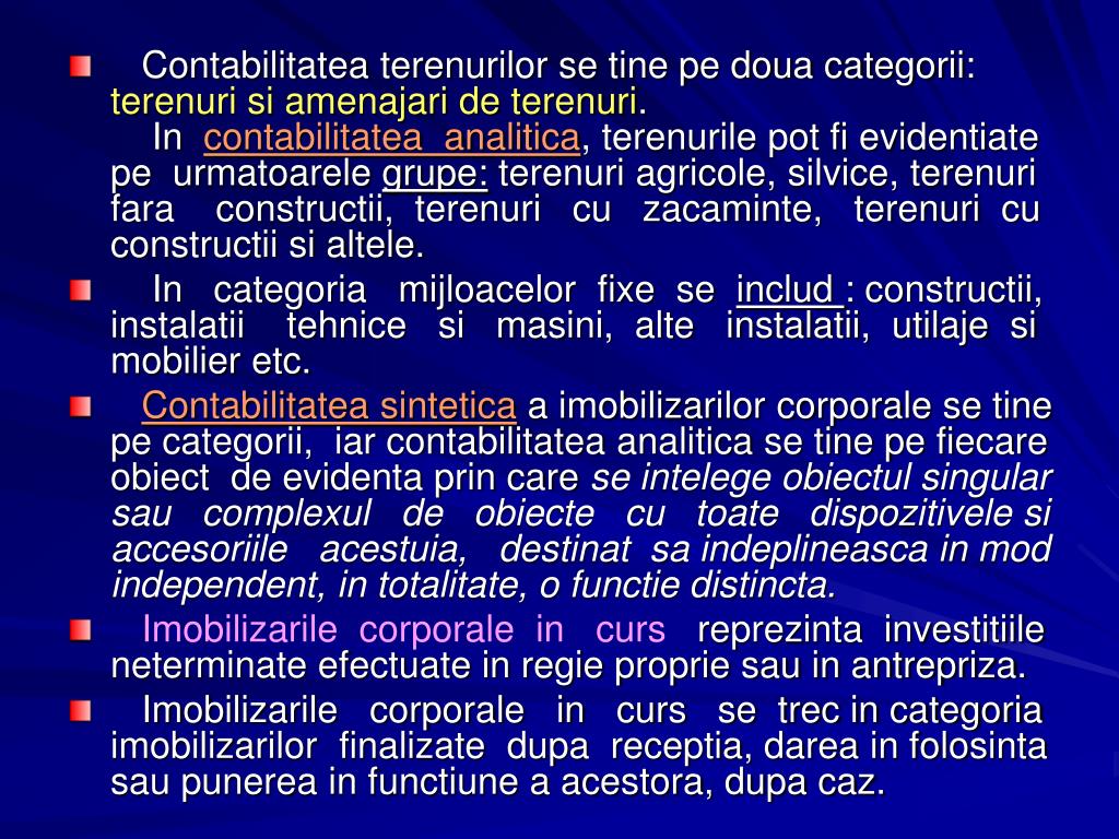 Contabilitatea terenurilor se tine pe doua categorii: terenuri si amenajari de terenuri. In contabilitatea analitica, terenurile pot fi evidentiate pe urmatoarele grupe: terenuri agricole, silvice, terenuri fara constructii, terenuri cu zacaminte, terenuri cu constructii si altele. • In categoria mijloacelor fixe se includ : constructii, instalatii tehnice si masini, alte instalatii, utilaje si mobilier etc. • Contabilitatea sintetica a imobilizarilor corporale se tine pe categorii, iar contabilitatea analitica se tine pe fiecare obiect de evidenta prin care se intelege obiectul singular sau complexul de obiecte cu toate dispozitivele si accesoriile acestuia, destinat sa indeplineasca in mod independent, in totalitate, o functie distincta. • Imobilizarile corporale in curs reprezinta investitiile neterminate efectuate in regie proprie sau in antrepriza. • Imobilizarile corporale in curs se trec in categoria imobilizarilor finalizate dupa receptia, darea in folosinta sau punerea in functiune a acestora, dupa caz.