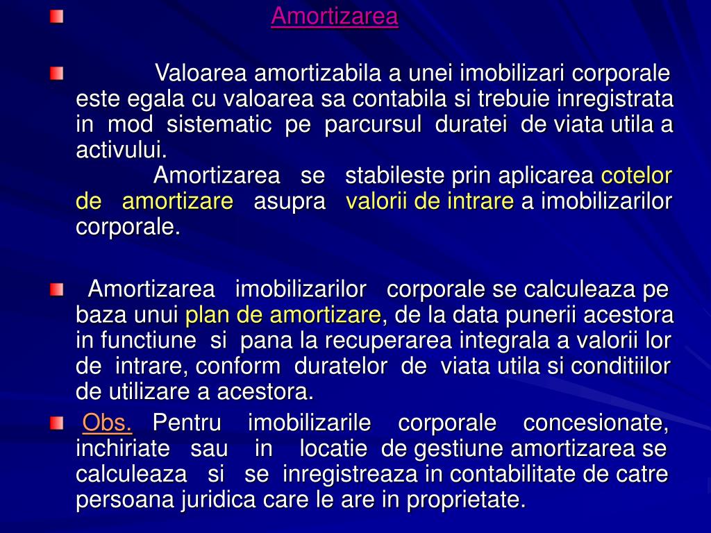 Amortizarea • Valoarea amortizabila a unei imobilizari corporale este egala cu valoarea sa contabila si trebuie inregistrata in mod sistematic pe parcursul duratei de viata utila a activului. Amortizarea se stabileste prin aplicarea cotelor de amortizare asupra valorii de intrare a imobilizarilor corporale. • Amortizarea imobilizarilor corporale se calculeaza pe baza unui plan de amortizare, de la data punerii acestora in functiune si pana la recuperarea integrala a valorii lor de intrare, conform duratelor de viata utila si conditiilor de utilizare a acestora. • Obs. Pentru imobilizarile corporale concesionate, inchiriate sau in locatie de gestiune amortizarea se calculeaza si se inregistreaza in contabilitate de catre persoana juridica care le are in proprietate.