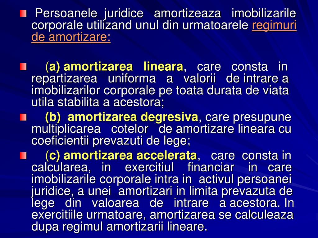 Persoanele juridice amortizeaza imobilizarile corporale utilizand unul din urmatoarele regimuri de amortizare: • (a) amortizarea lineara, care consta in repartizarea uniforma a valorii de intrare a imobilizarilor corporale pe toata durata de viata utila stabilita a acestora; • (b) amortizarea degresiva, care presupune multiplicarea cotelor de amortizare lineara cu coeficientii prevazuti de lege; • (c) amortizarea accelerata, care consta in calcularea, in exercitiul financiar in care imobilizarile corporale intra in activul persoanei juridice, a unei amortizari in limita prevazuta de lege din valoarea de intrare a acestora. In exercitiile urmatoare, amortizarea se calculeaza dupa regimul amortizarii lineare.