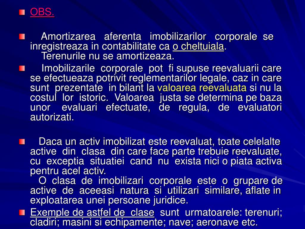 OBS. • Amortizarea aferenta imobilizarilor corporale se inregistreaza in contabilitate ca o cheltuiala. Terenurile nu se amortizeaza. • Imobilizarile corporale pot fi supuse reevaluarii care se efectueaza potrivit reglementarilor legale, caz in care sunt prezentate in bilant la valoarea reevaluata si nu la costul lor istoric. Valoarea justa se determina pe baza unor evaluari efectuate, de regula, de evaluatori autorizati. • Daca un activ imobilizat este reevaluat, toate celelalte active din clasa din care face parte trebuie reevaluate, cu exceptia situatiei cand nu exista nici o piata activa pentru acel activ. O clasa de imobilizari corporale este o grupare de active de aceeasi natura si utilizari similare, aflate in exploatarea unei persoane juridice. • Exemple de astfel de clase sunt urmatoarele: terenuri; cladiri; masini si echipamente; nave; aeronave etc.