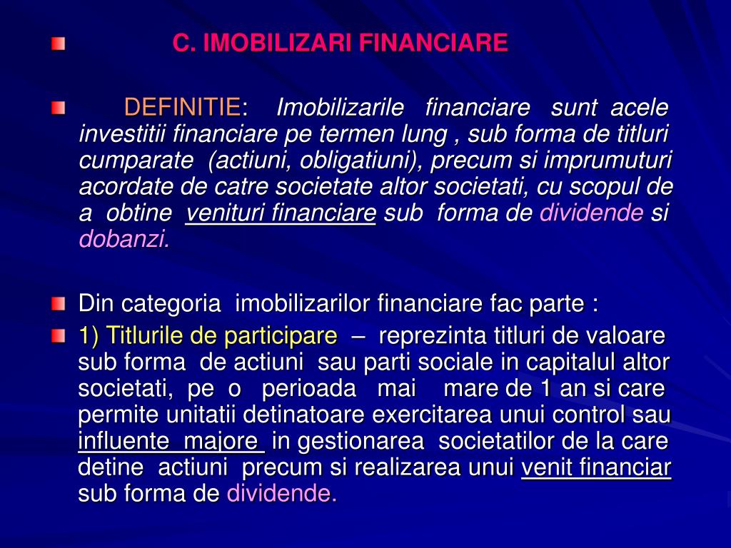 C. IMOBILIZARI FINANCIARE • DEFINITIE: Imobilizarile financiare sunt acele investitii financiare pe termen lung , sub forma de titluri cumparate (actiuni, obligatiuni), precum si imprumuturi acordate de catre societate altor societati, cu scopul de a obtine venituri financiare sub forma de dividende si dobanzi. • Din categoria imobilizarilor financiare fac parte : • 1) Titlurile de participare – reprezinta titluri de valoare sub forma de actiuni sau parti sociale in capitalul altor societati, pe o perioada mai mare de 1 an si care permite unitatii detinatoare exercitarea unui control sau influente majore in gestionarea societatilor de la care detine actiuni precum si realizarea unui venit financiar sub forma de dividende.