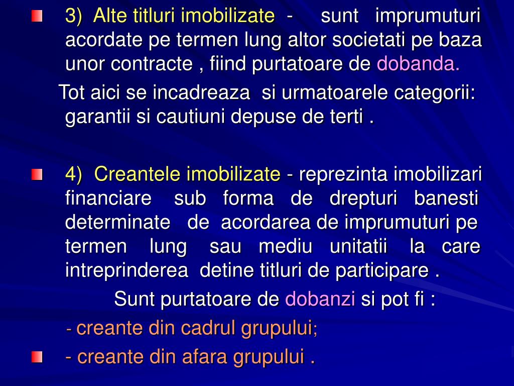 3) Alte titluri imobilizate - sunt imprumuturi acordate pe termen lung altor societati pe baza unor contracte , fiind purtatoare de dobanda. Tot aici se incadreaza si urmatoarele categorii: garantii si cautiuni depuse de terti . • 4) Creantele imobilizate - reprezinta imobilizari financiare sub forma de drepturi banesti determinate de acordarea de imprumuturi pe termen lung sau mediu unitatii la care intreprinderea detine titluri de participare . Sunt purtatoare de dobanzi si pot fi : - creante din cadrul grupului; • - creante din afara grupului .