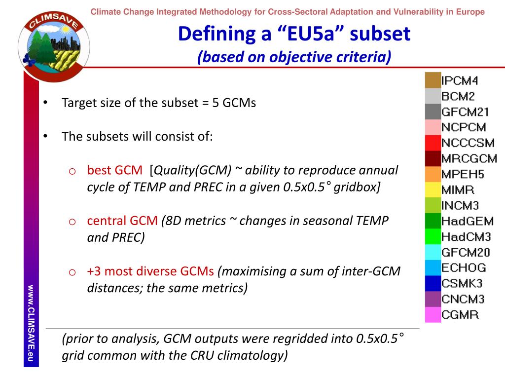 Defining a “EU5a” subset(based on objective criteria) • Target size of the subset = 5 GCMs • The subsets will consist of: • best GCM [Quality(GCM) ~ ability to reproduce annual cycle of TEMP and PREC in a given 0.5x0.5°gridbox] • central GCM(8D metrics ~ changes in seasonal TEMP and PREC) • +3 most diverse GCMs(maximising a sum of inter-GCM distances; the same metrics) • (prior to analysis, GCM outputs were regridded into 0.5x0.5° grid common with the CRU climatology)