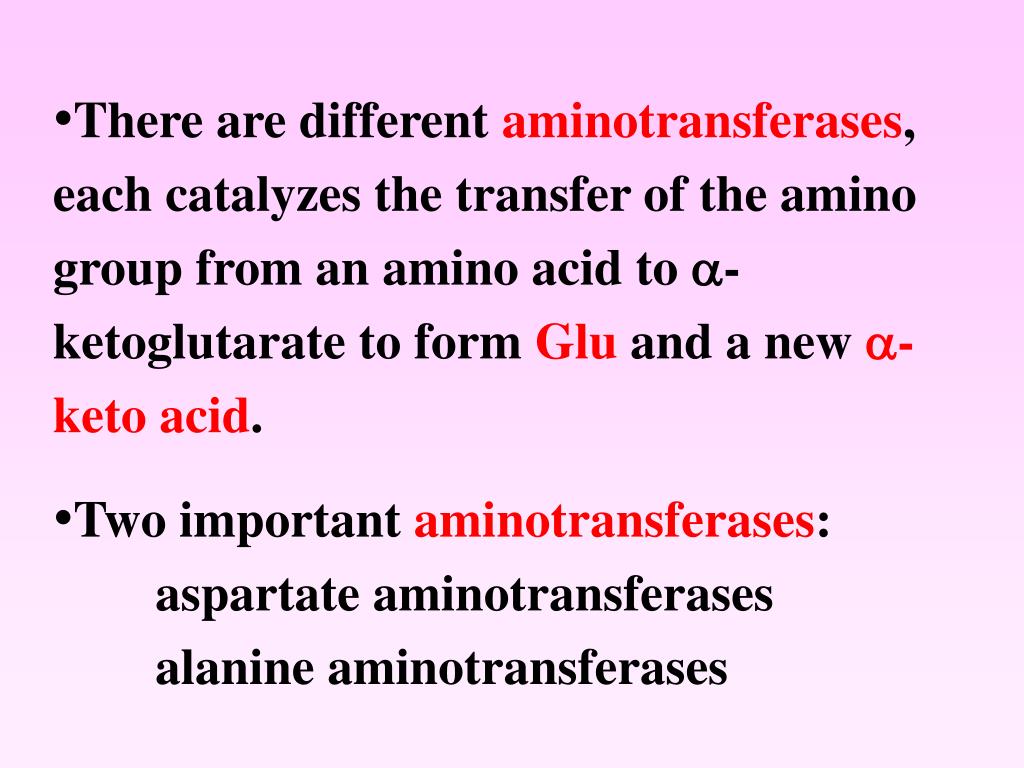 There are different aminotransferases, each catalyzes the transfer of the amino group from an amino acid to a-ketoglutarate to form Glu and a new a-keto acid. • Two important aminotransferases: aspartate aminotransferases alanine aminotransferases