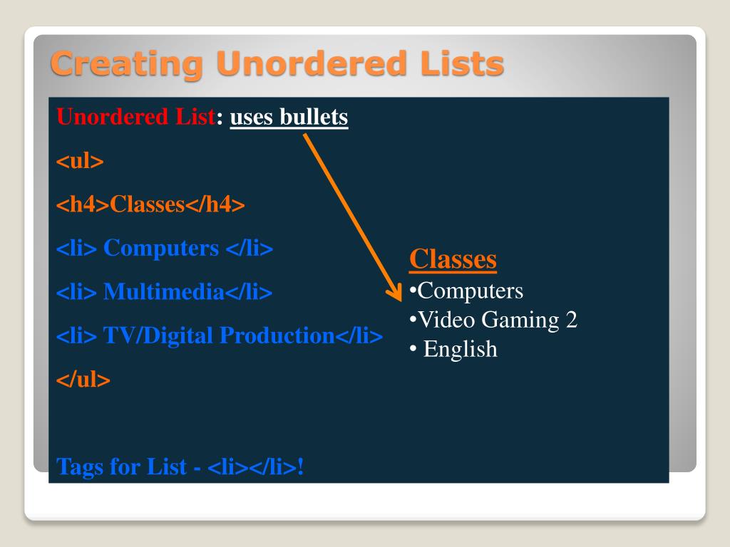 Creating Ordered Lists Ordered List: numbered <ol> <h4>Classes</h4> <li> Computers </li> <li> Multimedia</li> <li> TV/Digital Production</li> </ol> Tags for List - <li></li>! Classes Computers Video Gaming2 English