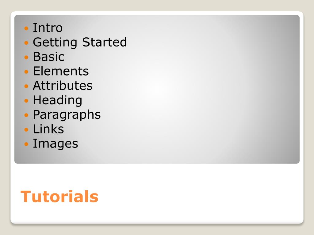 Tutorials Intro Getting Started Basic Elements Attributes Heading Paragraphs Links Images