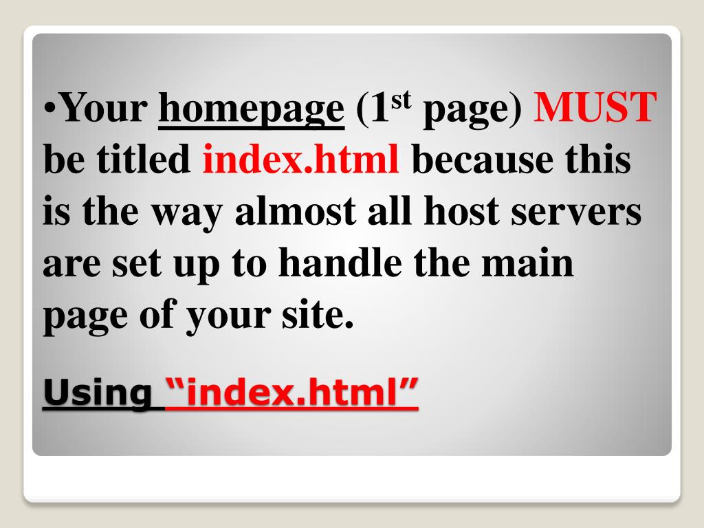 Your homepage (1st page) MUST be titled index.html because this is the way almost all host servers are set up to handle the main page of your site. Using “index.html”
