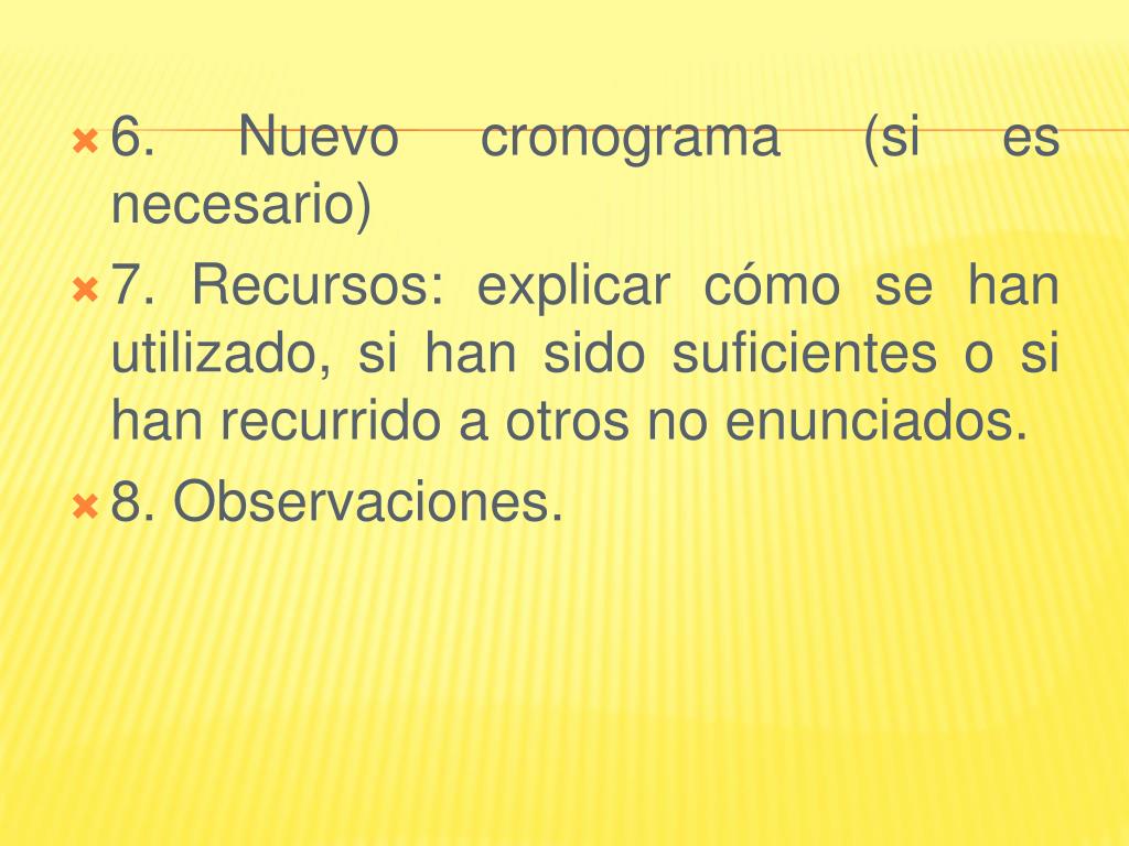 6. Nuevo cronograma (si es necesario) 7. Recursos: explicar cómo se han utilizado, si han sido suficientes o si han recurrido a otros no enunciados. 8. Observaciones.
