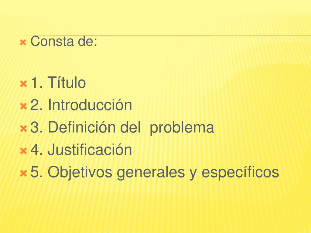 Consta de: 1. Título 2. Introducción 3. Definición del problema 4. Justificación 5. Objetivos generales y específicos