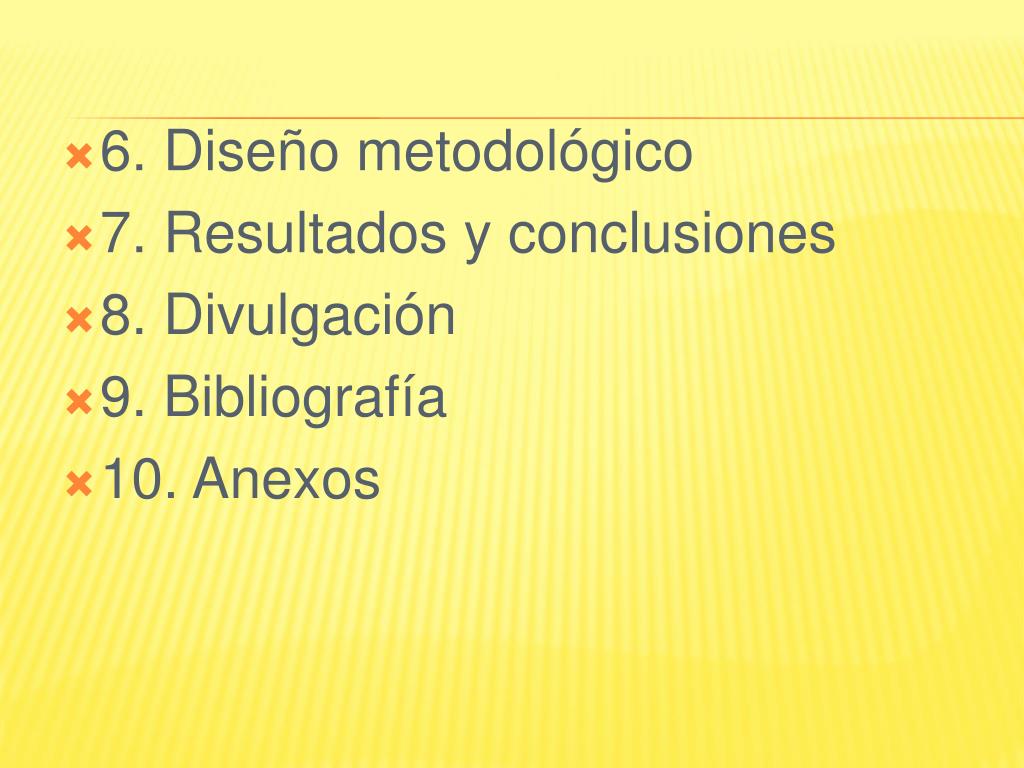 6. Diseño metodológico 7. Resultados y conclusiones 8. Divulgación 9. Bibliografía 10. Anexos