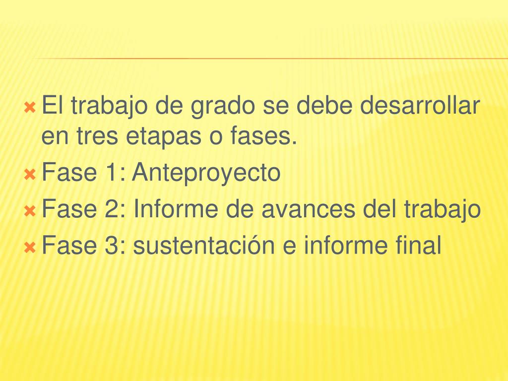 El trabajo de grado se debe desarrollar en tres etapas o fases. Fase 1: Anteproyecto Fase 2: Informe de avances del trabajo Fase 3: sustentación e informe final