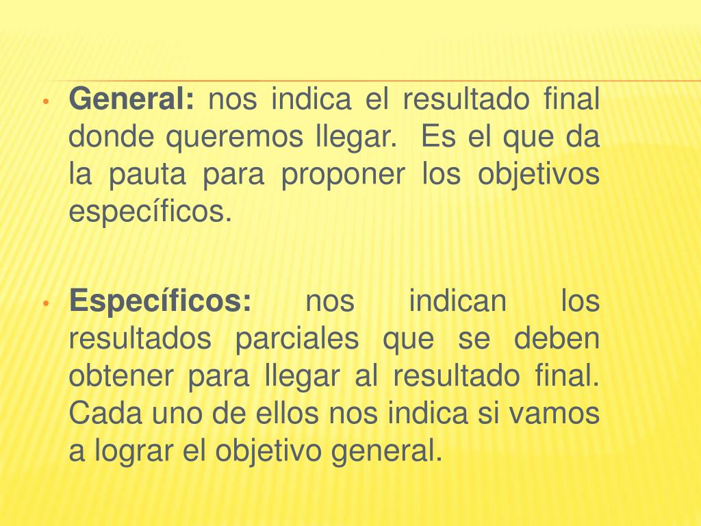 General: nos indica el resultado final donde queremos llegar. Es el que da la pauta para proponer los objetivos específicos. • Específicos: nos indican los resultados parciales que se deben obtener para llegar al resultado final. Cada uno de ellos nos indica si vamos a lograr el objetivo general.