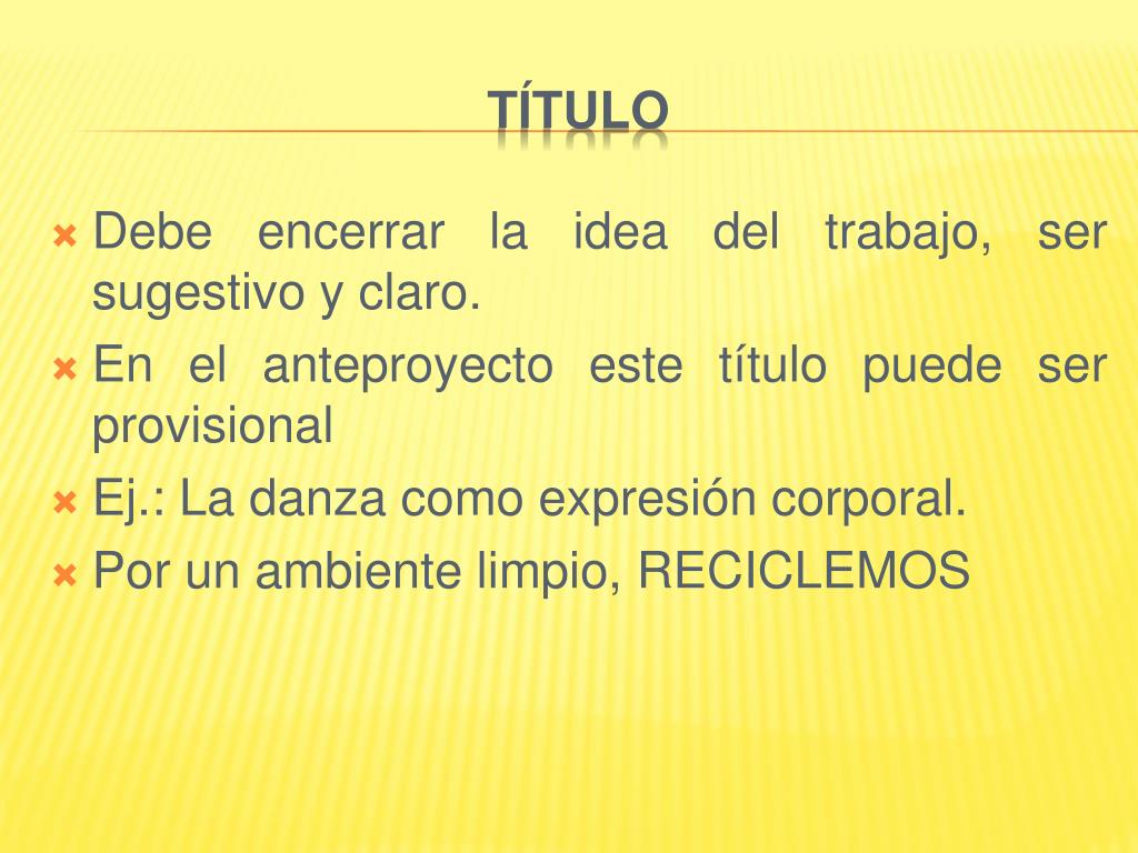 Debe encerrar la idea del trabajo, ser sugestivo y claro. En el anteproyecto este título puede ser provisional Ej.: La danza como expresión corporal. Por un ambiente limpio, RECICLEMOS TÍTULO
