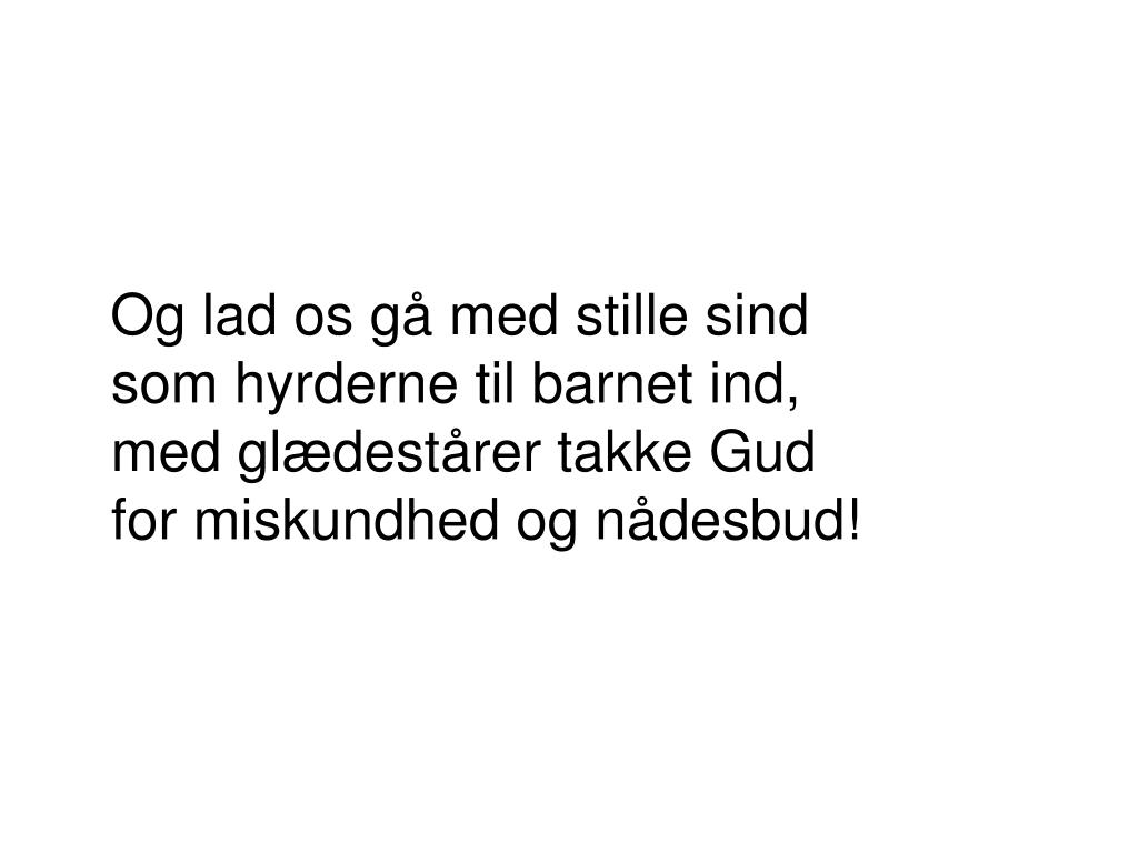 Og lad os gå med stille sindsom hyrderne til barnet ind,med glædestårer takke Gudfor miskundhed og nådesbud!