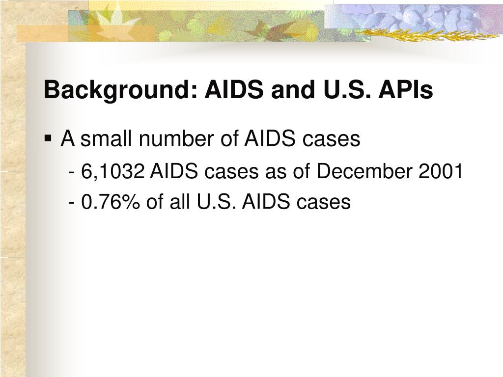 Background: AIDS and U.S. APIs • A small number of AIDS cases • - 6,1032 AIDS cases as of December 2001 • - 0.76% of all U.S. AIDS cases