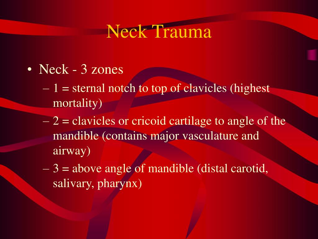 Neck Trauma • Neck - 3 zones • 1 = sternal notch to top of clavicles (highest mortality) • 2 = clavicles or cricoid cartilage to angle of the mandible (contains major vasculature and airway) • 3 = above angle of mandible (distal carotid, salivary, pharynx)