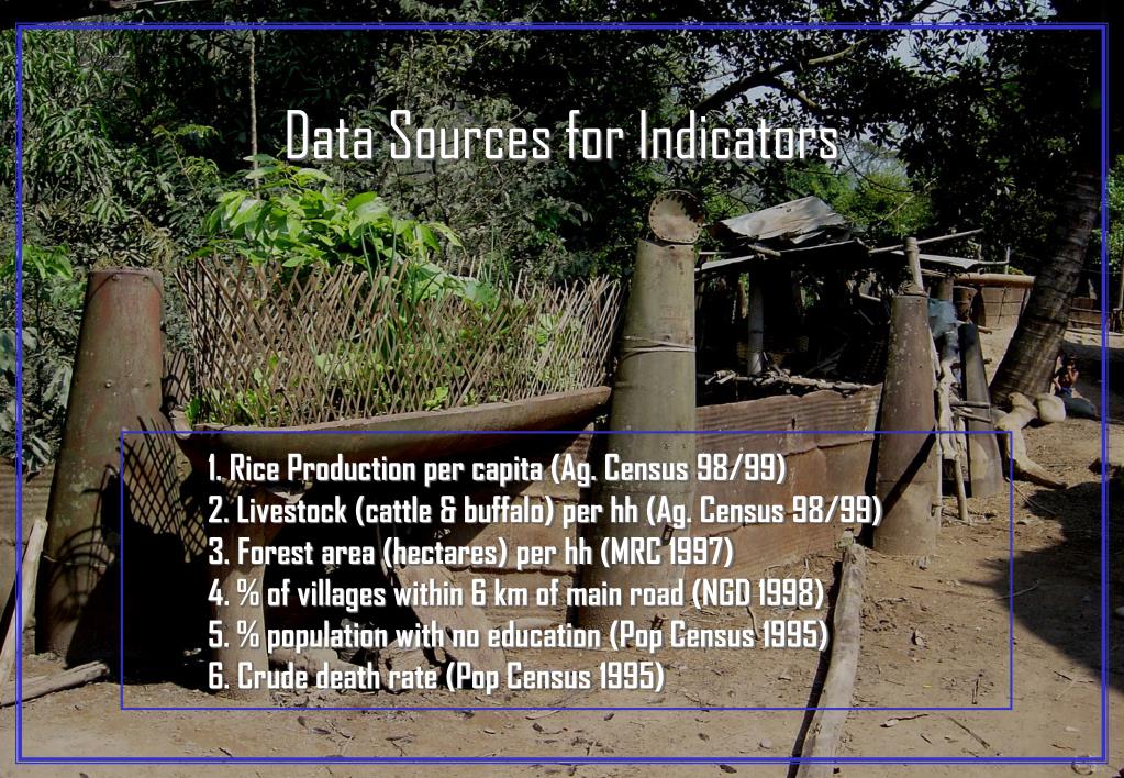 Data Sources for Indicators 1. Rice Production per capita (Ag. Census 98/99) 2. Livestock (cattle & buffalo) per hh (Ag. Census 98/99) 3. Forest area (hectares) per hh (MRC 1997) 4. % of villages within 6 km of main road (NGD 1998) 5. % population with no education (Pop Census 1995) 6. Crude death rate (Pop Census 1995)