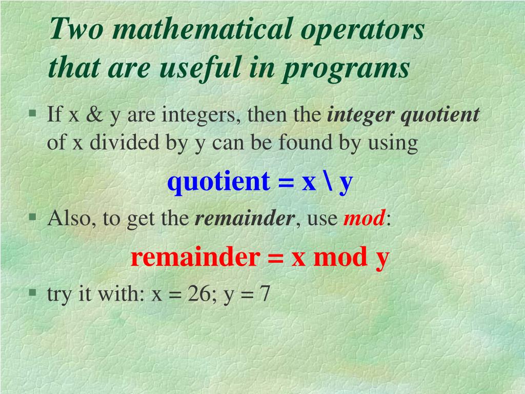 Two mathematical operators that are useful in programs • If x & y are integers, then the integer quotient of x divided by y can be found by using \ quotient = x \ y • Also, to get the remainder, use mod: remainder = x mod y • try it with: x = 26; y = 7
