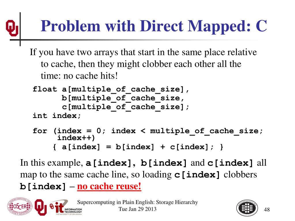 Problem with Direct Mapped: C If you have two arrays that start in the same place relative to cache, then they might clobber each other all the time: no cache hits! float a[multiple_of_cache_size], b[multiple_of_cache_size, c[multiple_of_cache_size]; int index; for (index = 0; index < multiple_of_cache_size; index++) { a[index] = b[index] + c[index]; } In this example, a[index], b[index] and c[index] all map to the same cache line, so loading c[index] clobbers b[index] – no cache reuse! Supercomputing in Plain English: Storage Hierarchy Tue Jan 29 2013