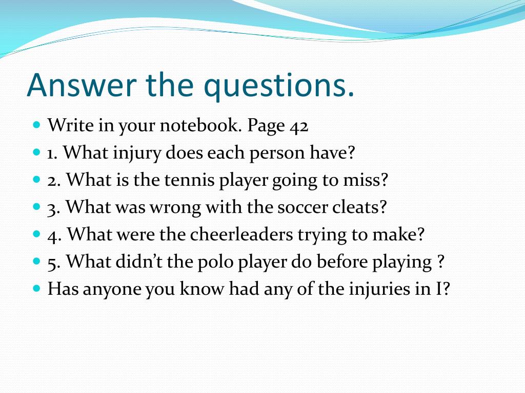 Answer the questions. • Write in your notebook. Page 42 • 1. What injury does each person have? • 2. What is the tennis player going to miss? • 3. What was wrong with the soccer cleats? • 4. What were the cheerleaders trying to make? • 5. What didn’t the polo player do before playing ? • Has anyone you know had any of the injuries in I?