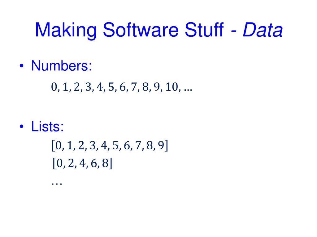 Making Software Stuff- Data • Empty list is represented by the constant • Non-empty list is constructed using the operator (pronounced “cons”) • Example, the list even numbers [ 0, 2, 4, 6, 8 ] is represented by 0 :: (2 :: (4 :: (6 :: (8 :: ))))