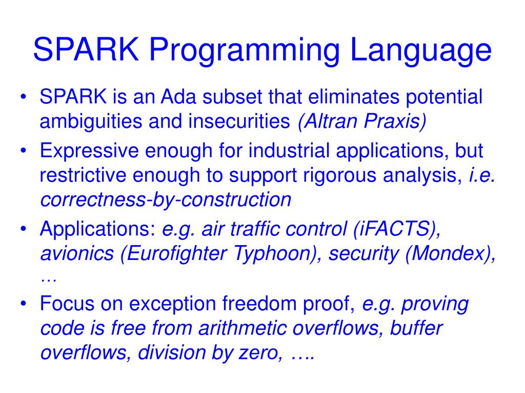 SPARK Programming Language • SPARK is anAda subset that eliminates potential ambiguities and insecurities (Altran Praxis) • Expressive enough for industrial applications, but restrictive enough to support rigorous analysis, i.e. correctness-by-construction • Applications: e.g. air traffic control (iFACTS), avionics (Eurofighter Typhoon), security (Mondex), … • Focus on exception freedom proof, e.g. proving code is free from arithmetic overflows, buffer overflows, division by zero, ….