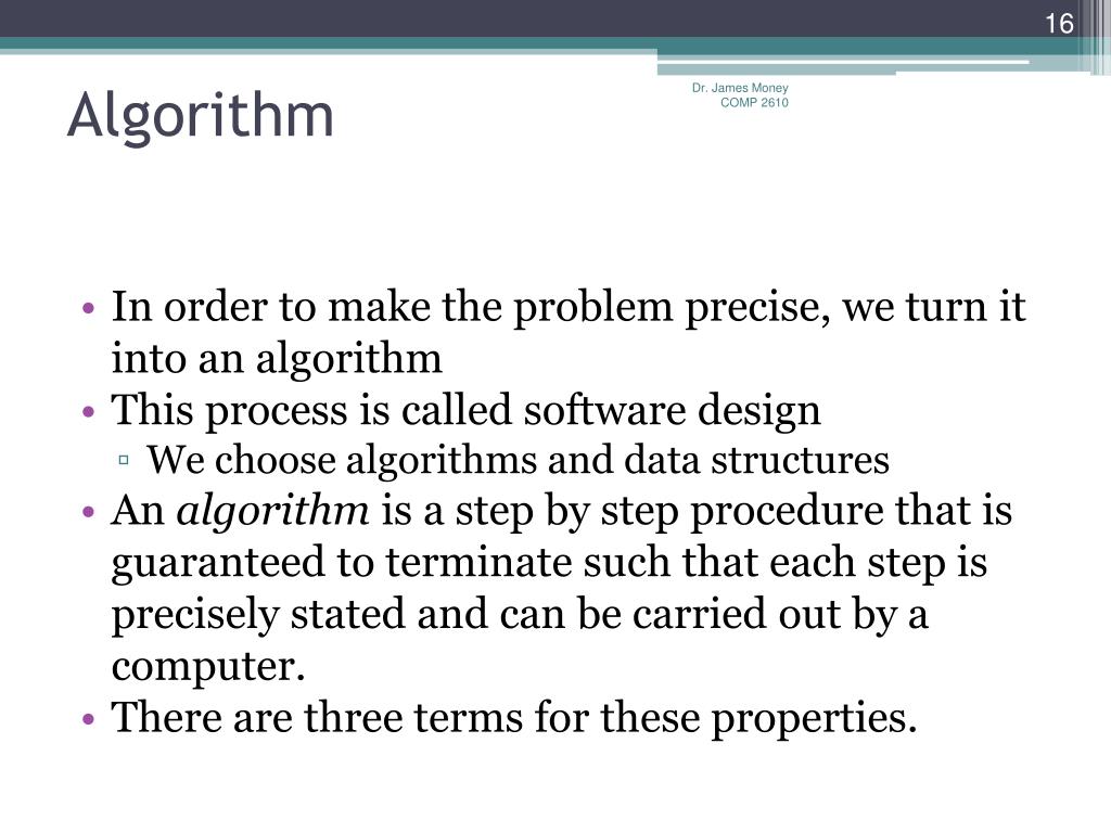 Algorithm Dr. James Money COMP 2610 • In order to make the problem precise, we turn it into an algorithm • This process is called software design • We choose algorithms and data structures • An algorithm is a step by step procedure that is guaranteed to terminate such that each step is precisely stated and can be carried out by a computer. • There are three terms for these properties.