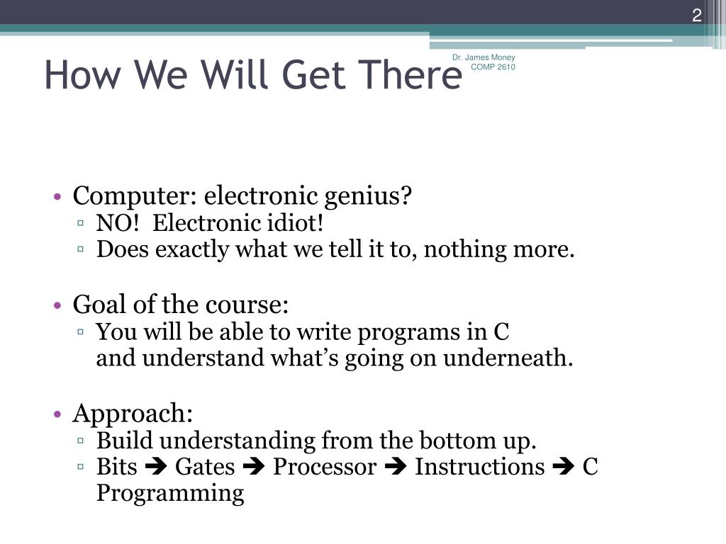 Welcome Aboard – Chapter 1. COMP 2610. How We Will Get There. Computer: electronic genius? NO! Electronic idiot! Does exactly what we tell it to, nothing more. Goal of the course: You will be able to write programs in C and understand what’s going on underneath. Approach:
