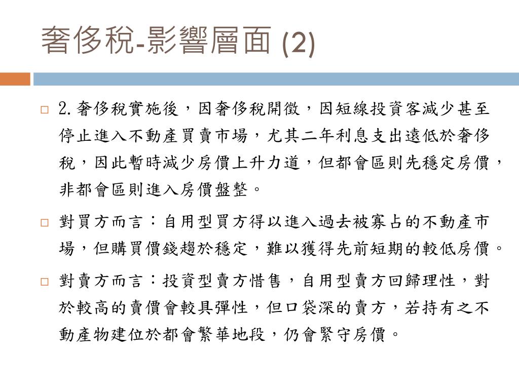 奢侈稅-影響層面 (1) • 1.奢侈稅實施日之前,短線投資客會將手中的投資物件以較低的價格拋出,使得房價下降。 • 對買方而言: 短期內因房價下降,會增加買方的購買意願。 • 對賣方而言:短線投資客勢必減少其獲利,而自用型的屋主也同時減少其利得。