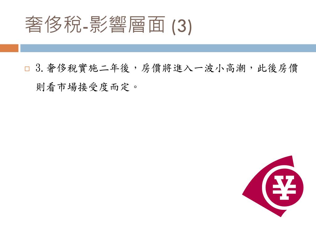 奢侈稅-影響層面 (3) • 3.奢侈稅實施二年後,房價將進入一波小高潮,此後房價則看市場接受度而定。