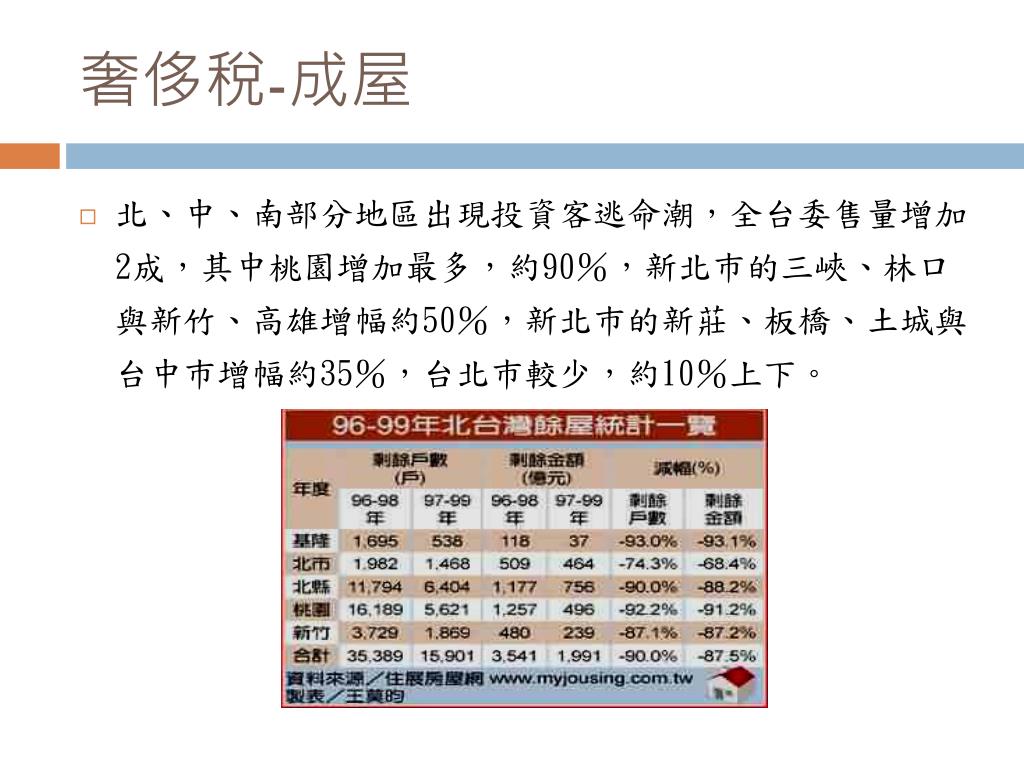奢侈稅-成屋 • 北、中、南部分地區出現投資客逃命潮,全台委售量增加2成,其中桃園增加最多,約90%,新北巿的三峽、林口與新竹、高雄增幅約50%,新北巿的新莊、板橋、土城與台中巿增幅約35%,台北巿較少,約10%上下。