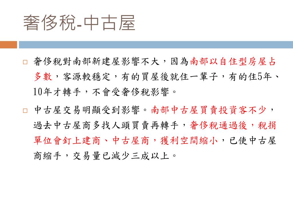 奢侈稅-中古屋 • 奢侈稅對南部新建屋影響不大,因為南部以自住型房屋占多數,客源較穩定,有的買屋後就住一輩子,有的住5年、10年才轉手,不會受奢侈稅影響。 • 中古屋交易明顯受到影響。南部中古屋買賣投資客不少,過去中古屋商多找人頭買賣再轉手,奢侈稅通過後,稅捐單位會釘上建商、中古屋商,獲利空間縮小,已使中古屋商縮手,交易量已減少三成以上。