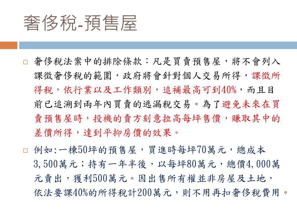 奢侈稅-預售屋 • 奢侈稅法案中的排除條款:凡是買賣預售屋,將不會列入課徵奢侈稅的範圍,政府將會針對個人交易所得,課徵所得稅,依行業以及工作類別,追補最高可到40%,而且目前已追溯到兩年內買賣的逃漏稅交易。為了避免未來在買賣預售屋時,投機的賣方刻意拉高每坪售價,賺取其中的差價所得,達到平抑房價的效果。 • 例如:一棟50坪的預售屋,買進時每坪70萬元,總成本3,500萬元;持有一年半後,以每坪80萬元,總價4,000萬元賣出,獲利500萬元。因出售所有權並非房屋及土地,依法要課40%的所得稅計200萬元,則不用再扣奢侈稅費用。