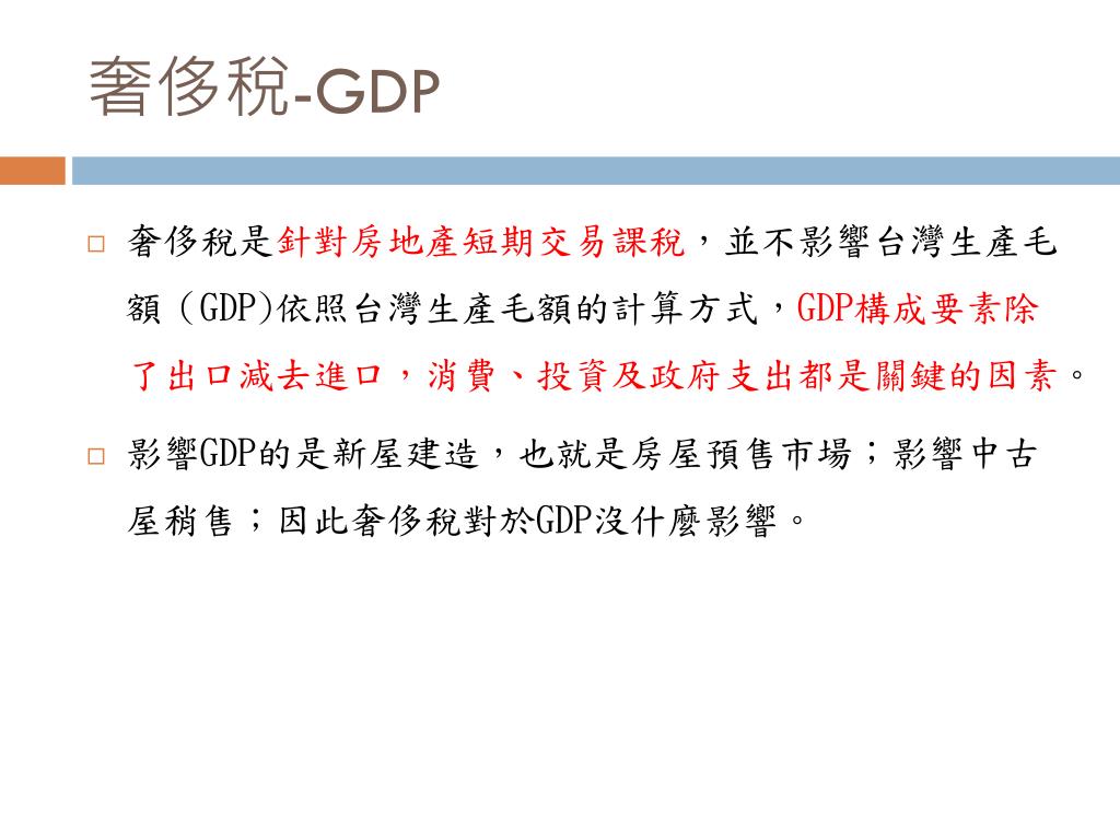 奢侈稅-GDP • 奢侈稅是針對房地產短期交易課稅,並不影響台灣生產毛額(GDP)依照台灣生產毛額的計算方式,GDP構成要素除了出口減去進口,消費、投資及政府支出都是關鍵的因素。 • 影響GDP的是新屋建造,也就是房屋預售市場;影響中古屋稍售;因此奢侈稅對於GDP沒什麼影響。