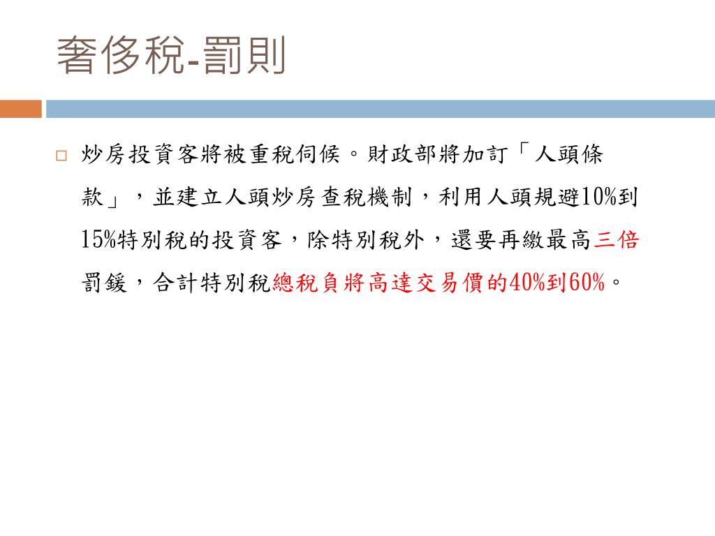 奢侈稅-罰則 • 炒房投資客將被重稅伺候。財政部將加訂「人頭條款」,並建立人頭炒房查稅機制,利用人頭規避10%到15%特別稅的投資客,除特別稅外,還要再繳最高三倍罰鍰,合計特別稅總稅負將高達交易價的40%到60%。
