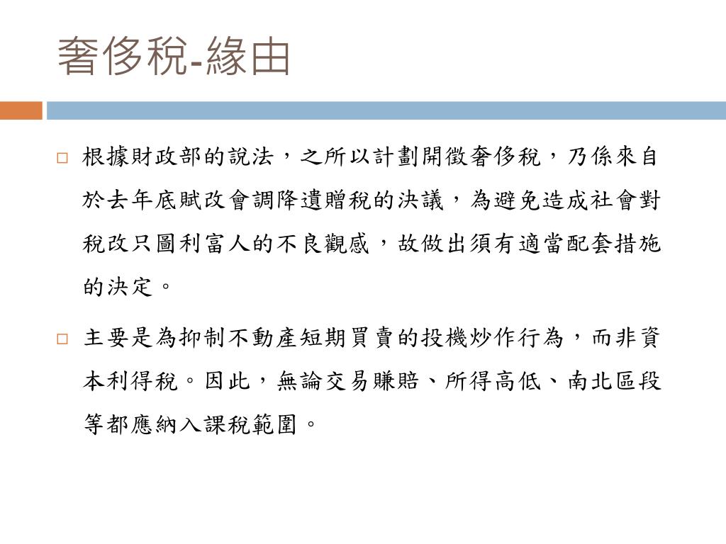 奢侈稅-緣由 • 根據財政部的說法,之所以計劃開徵奢侈稅,乃係來自於去年底賦改會調降遺贈稅的決議,為避免造成社會對稅改只圖利富人的不良觀感,故做出須有適當配套措施的決定。 • 主要是為抑制不動產短期買賣的投機炒作行為,而非資本利得稅。因此,無論交易賺賠、所得高低、南北區段等都應納入課稅範圍。