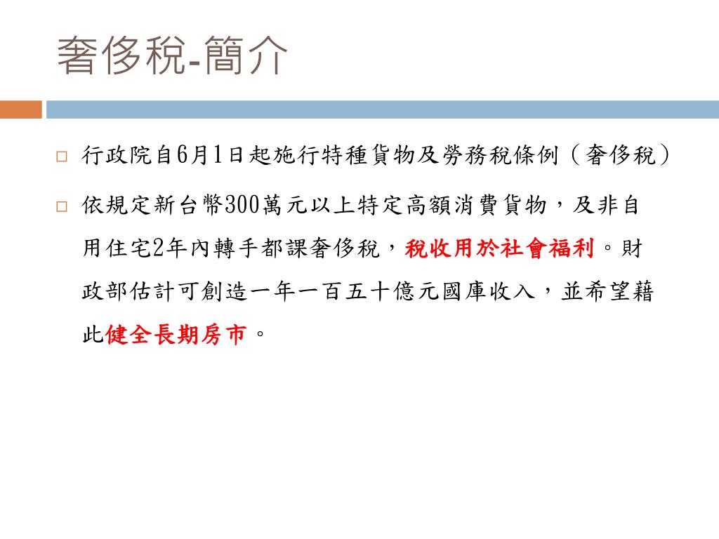 奢侈稅-簡介 • 行政院自6月1日起施行特種貨物及勞務稅條例(奢侈稅) • 依規定新台幣300萬元以上特定高額消費貨物,及非自用住宅2年內轉手都課奢侈稅,稅收用於社會福利。財政部估計可創造一年一百五十億元國庫收入,並希望藉此健全長期房市。